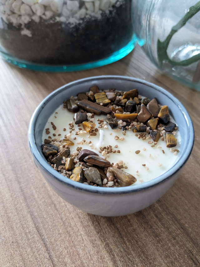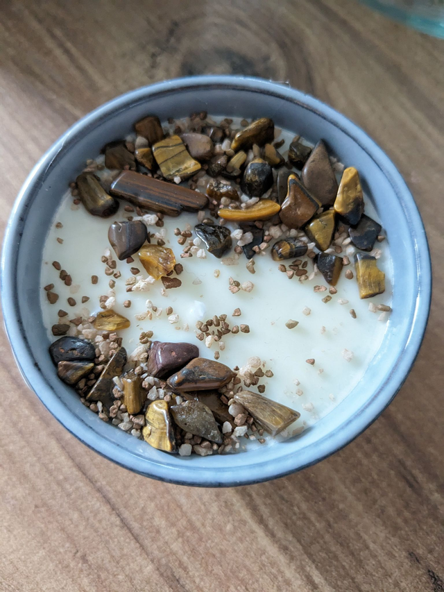 Bougie en cire de soja et parfum de Grasse. Pierres naturelles Oeil de tigre.